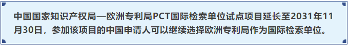 中国国家知识产权局和欧洲专利局共同宣布,允许中国申请人指定欧洲专利局为国际检索单位(ISA)的PCT试点合作项目,将延长至2031年11月30日。